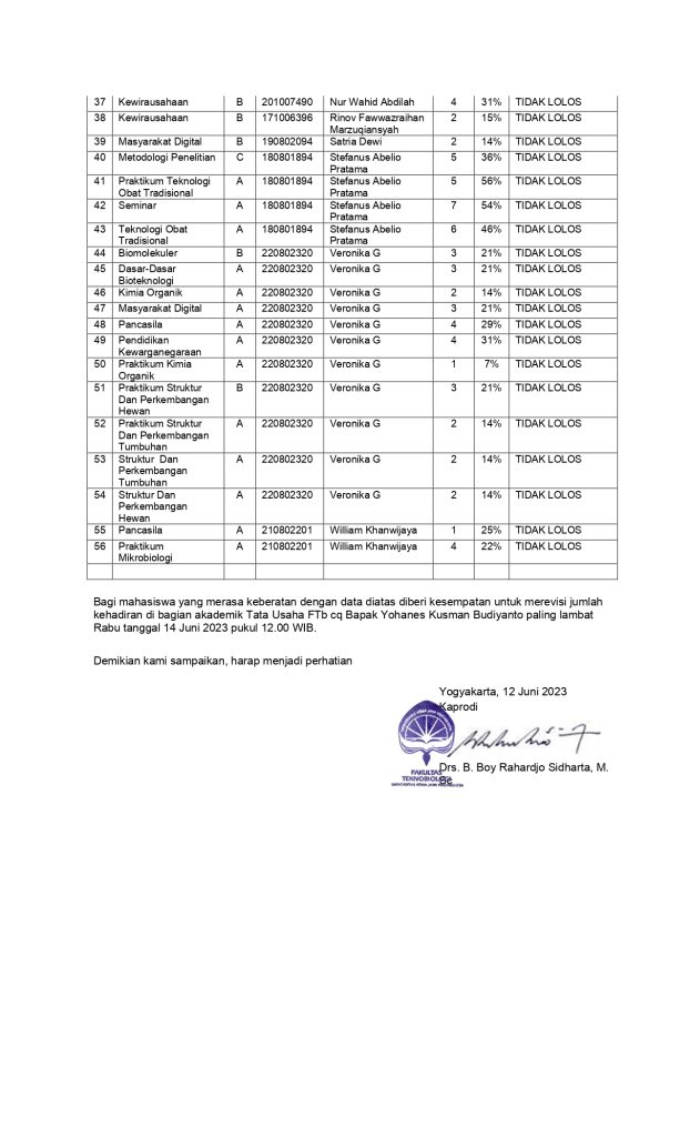 Daftar Mahasiswa yang Tidak Lolos 75% Kehadiran Kuliah
