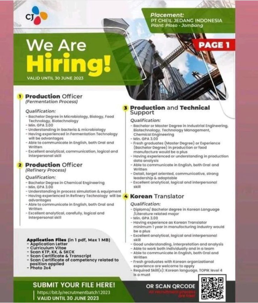 PT. Cheil Jedang Indonesia membuka lowongan kerja untuk lulusan Mikrobiologi, Biologi, Teknologi Pangan. Syarat dan pengumuman selengkapnya dapat dilihat di bawah ini