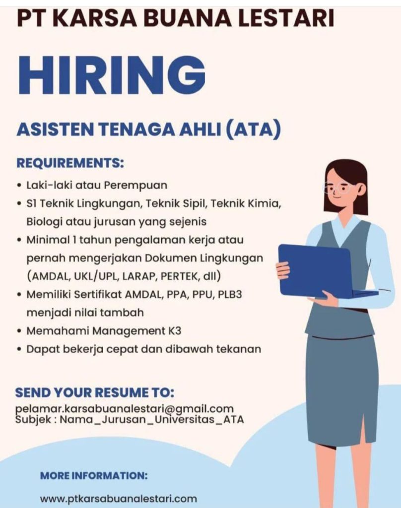 PT. Karsa Buana Lestari membuka lowongan kerja untuk lulusan S1 Biologi, Teknik Lingkungan, Teknik Sipil, Teknik Kimia. Syarat dan pengumuman selengkapnya dapat dilihat di bawah ini