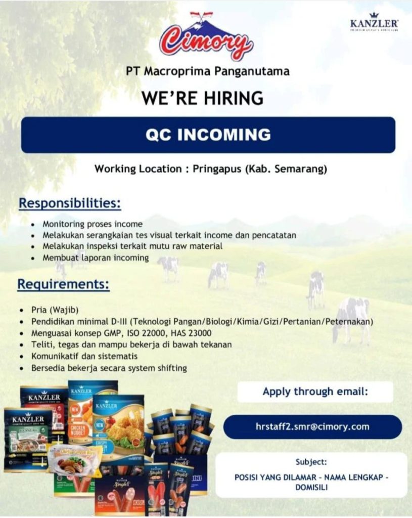 PT. Macroprima Panganutama membuka lowongan kerja untuk lulusan Teknologi Pangan, Biologi, Kimia, Gizi, Pertanian, Peternakan. Syarat dan pengumuman selengkapnya dapat dilihat di bawah ini