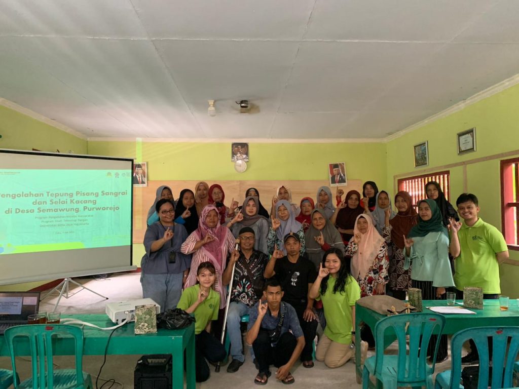 Pada tanggal 1 Mei 2024, Fakultas Teknobiologi Universitas Atma Jaya Yogyakarta melalui Program Studi Teknologi Pangan, mengadakan kegiatan Pengabdian kepada Masyarakat yang bertempat di Desa Semawung, Purworejo, Jawa Tengah. Acara ini merupakan tindak lanjut dari rangkaian acara pengabdian sebelumnya, khususnya mengenai pengolahan tepung pisang sangrai dan pembuatan selai kacang. Acara ini dihadiri oleh Kepala Desa Semawung, Andi Setiawan, dan diikuti oleh ibu-ibu dari Kelompok Usaha Inklusi Semawung (KUIS) dan Disabled People Organization (DPO) dari Yayasan Kristen untuk Kesehatan Umum (YAKKUM). Kehadiran mereka merupakan bukti nyata dari kesungguhan dan keterbukaan masyarakat dalam berdinamika secara inklusif bersama akademisi untuk meningkatkan nilai tambah produk lokal, dengan harapan dapat membantu perekonomian masyarakat.