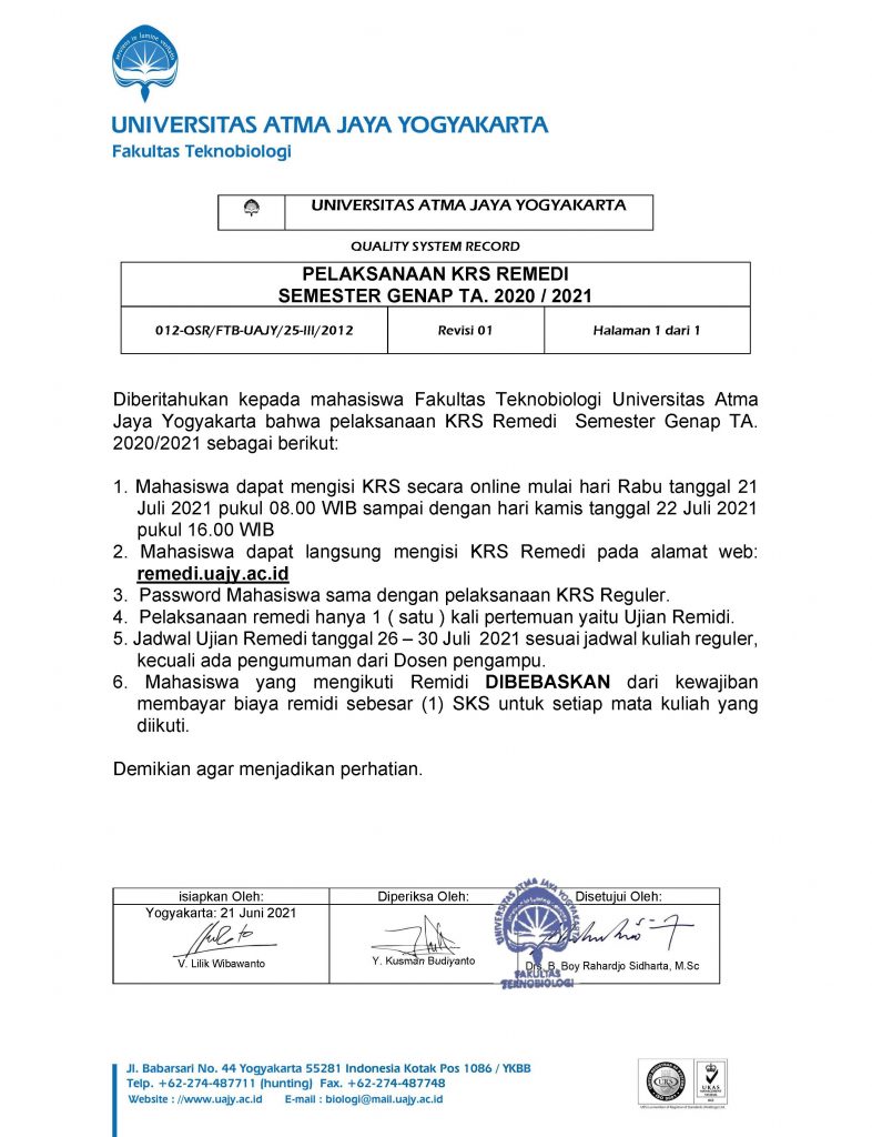 PELAKSANAAN KRS REMEDI SEMESTER GENAP TA. 2020 / 2021