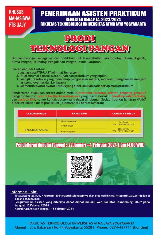 Penerimaan Asisten Praktikum Prodi Teknologi Pangan Semester Genap 2023-2024