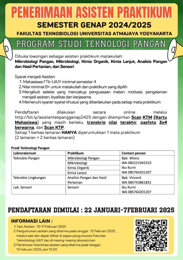 Penerimaan Asisten Praktikum Prodi Teknologi Pangan Semester Genap TA. 2024-2025