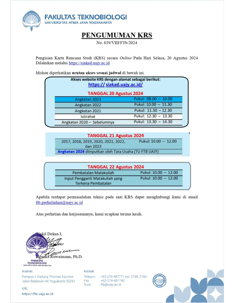 Pengumuman KRS Semester Gasal Fakultas Teknobiologi TA 2024-2025