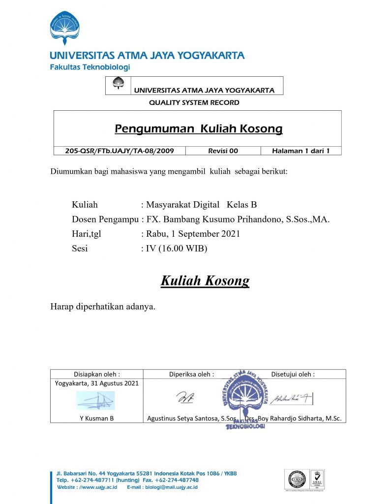 Pengumuman Kuliah Kosong Masyarakat Digital Kelas B