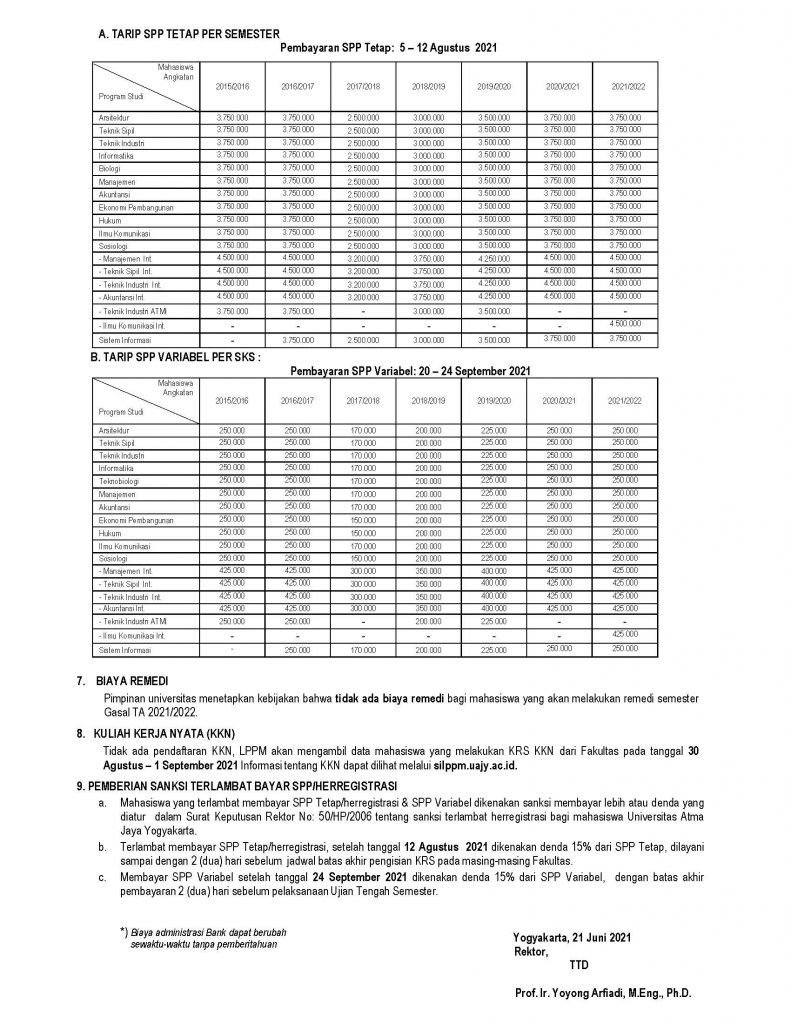 PENGUMUMAN NOMOR : 116/Reg/Aka/KAA/R TENTANG HERREGISTRASI & BIAYA PENDIDIKAN PROGRAM SARJANA UNIVERSITAS ATMA JAYA YOGYAKARTA SEMESTER GASAL T.A. 2021/2022