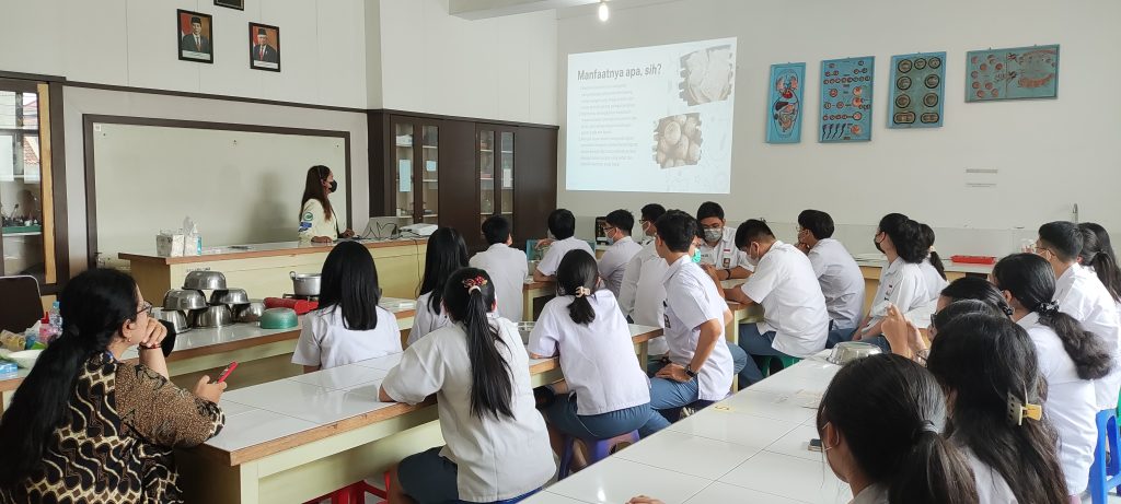 Acara diawali dengan doa bersama, sambutan Kepala Sekolah SMA Kalam Kudus Sukoharjo Bapak Gunowo, S.Si. Kegiatan selanjutnya adalah pengenalan Fakultas Teknobiologi dari narasumber yaitu Ibu Dr.rer.nat. Yuliana Reni Swasti, S.TP., MP. Setelah itu, peserta didik dibagi menjadi 2 kelompok dan mengikuti pelatihan pembuatan produk yang dipandu oleh dosen, Ibu Dr.rer.nat Yuliana Reni Swasti, S.TP., MP dan Ibu Leonie Margaretha Widya P, S.TP., M.Si dan mahasiswa Fakultas Teknobiologi, Devi Alvina, Kenyo Elok Aruni, dan Darwin Pratama.
