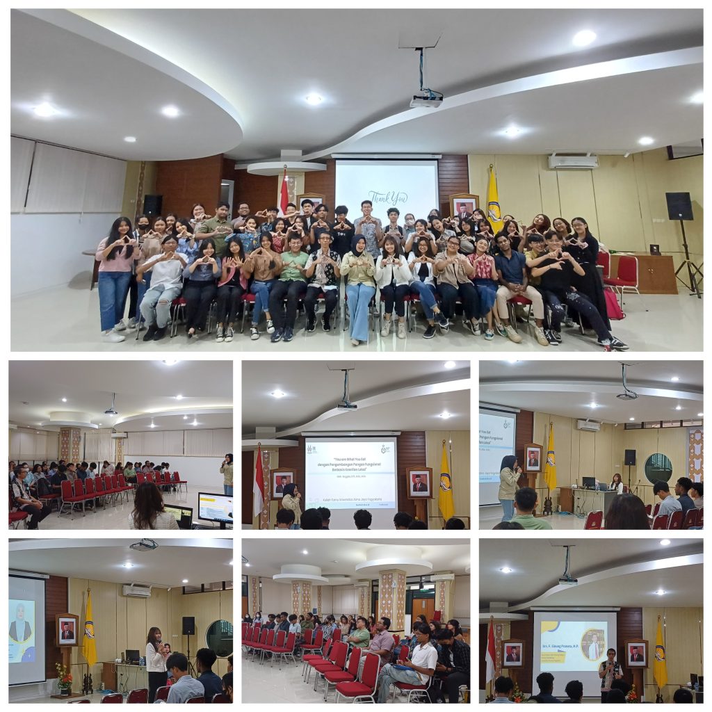 Sebagai bentuk pengembangan Fakultas dan Program Studi, Universitas Atma Jaya Yogyakarta menjalinan banyak kerjasama baik dengan industri maupun dengan perguruan tinggi lain, salah satunya dengan Institut Teknologi Kalimantan (ITK). Sebagai bentuk realisasi kerjasama antara prodi Teknologi Pangan UAJY dengan prodi Teknologi Pangan ITK diadakanlah kuliah tamu yang dibawakan oleh Koordinator Program Studi Teknologi Pangan ITK, Anggela, S.T.P., M.Sc., M.Sc.. Topik yang diangkat pada kuliah umum ini bertajuk “You are What You Eat dengan Pengembangan Pangan Fungsional Berbasis Kearifan Lokal”. Kuliah umum ini dibuka dengan sambutan dari Ketua Program Studi Teknologi Pangan UAJY, Drs. F. Sinung Pranata, M.P. dan diikuti dengan antusias oleh mahasiswa Program Studi Teknologi Pangan UAJY. Kuliah umum ini diadakan secara luring di Fakultas Teknobiologi UAJY pada hari Rabu, 29 November 2023.